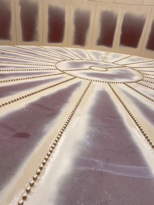 To begin, the crew prepared and protected the work area using cardboard and visqueen/poly sheeting, ensuring containment and safety throughout the process. Surface preparation followed SSPC-SP 10 Near White Metal Blast Cleaning Standards for abrasive sponge blasting and SSPC-SP 3 Power Tool Cleaning Standards for grinding, achieving an ideal profile for coating adhesion.